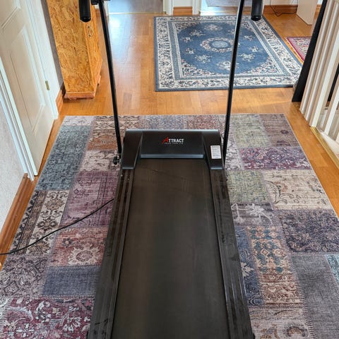 Löparband i svart färg. Utrustad med digital display och kontrollpanel för hastighetsinställning. Används för inomhusträning och löpning. Har fjärrkontroll men vet inte hur man kopplar