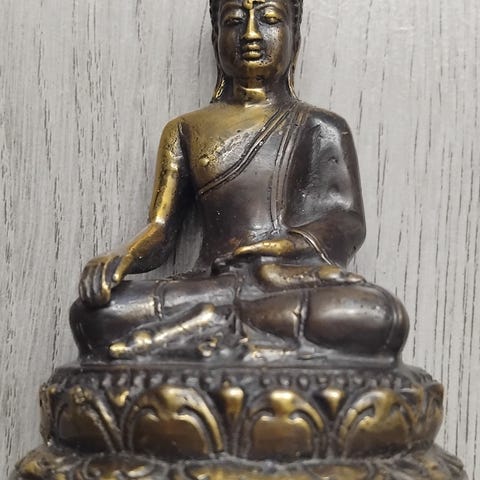 Säljer en vacker och detaljerad Buddha-staty, perfekt som en lugnande inredningsdetalj för hemmet, kontoret eller meditationshörnan. Statyn har en fin silverfärgad patina och sitter i en klassisk meditationsställning på en lotusbas.