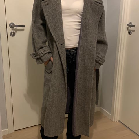 Tuff kappa med dubbelknäppning. Ett knytskärp och ett svart bälte. Snedfickor fram. Längd 100 cm.