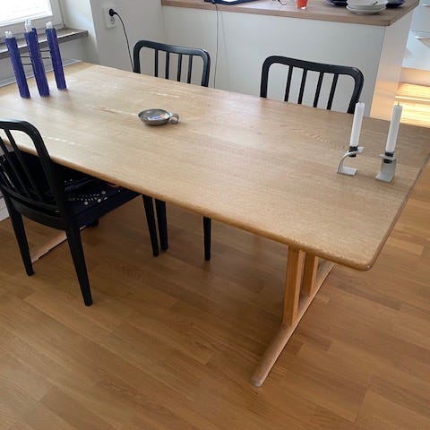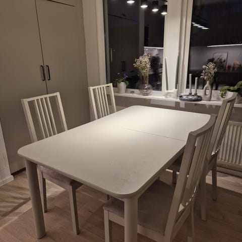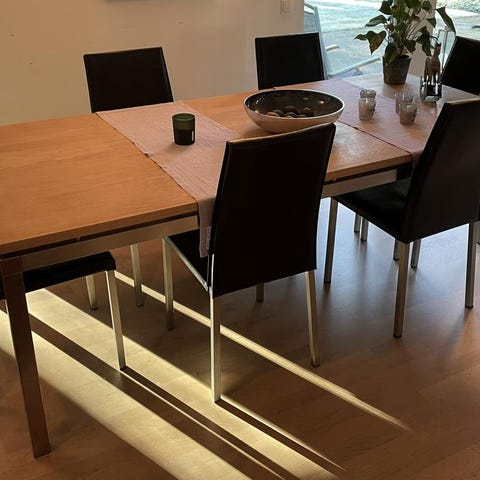 Ljust stavskiva i använt skick. 2 stolar också Glenn i gult läder för 300 st. Bordet kan köpas för 400kr.