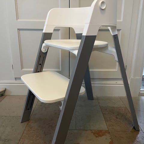 Stokke barnstol i trä med vit färg. Stolen är utformad för barn och har justerbar sits och fotstöd för att anpassas efter barnets storlek och behov.