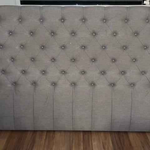 Mio sänggavel i beige tyg med knappdetaljer och stoppad design. Passar som huvudgavel till säng och ger stöd vid sittande position. Färgen är beige och materialet är sammet. Gaveln har fötter och står på egna ben.
