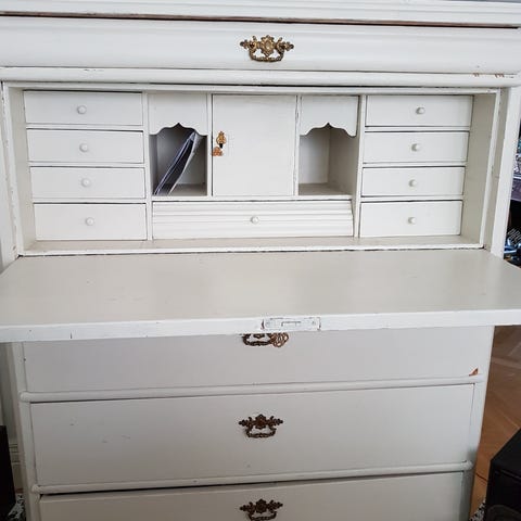 Sekretär skrivbord i trä med vit färg. Har en rundad lucka som kan rullas upp för att komma åt förvaringsutrymmen och små lådor. Utrustad med flera lådor nedtill för förvaring. Möbeln står på fyra ben och har ett klassiskt utförande. Har tappat lite färg på vissa ställen men inget som inte går att åtgärda med i fyllning och lite slipning!