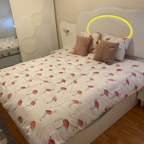 Säng 120 med undermadrass, nattduksbord, hylla, höj och sänkbar stol, sminkbord. Skicket är dugligt.