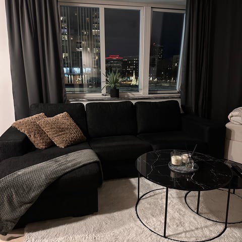 Mysig och snygg soffa i ljus grå. Väldigt fin. Två divaner på varsin sida. Hund finns i hemmet