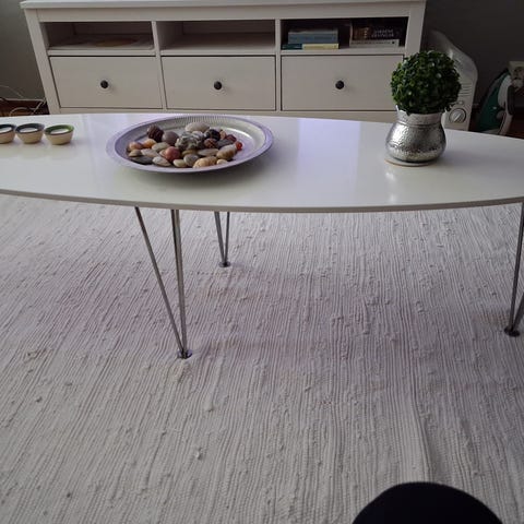 Soffbord från MIO ( L 130 B 80 H 50 ) vitlackerat elliptiskt med metallben. Bordet har några år på nacken, men har använts varsamt och är därför i gott skick.
