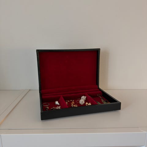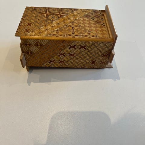 Det har gångjärn som gör att locket stängs lätt och skrinet är ganska litet.