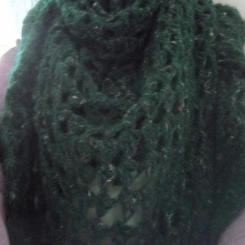 Säljer en virkad sjal i lila färg. Den mäter ca 56 cm lång och ca 101 cm bred. Osäker på materialet men tror typ att det är akryl eller något liknande. Garnet är väldigt mjukt mot huden och lite fluffigt.