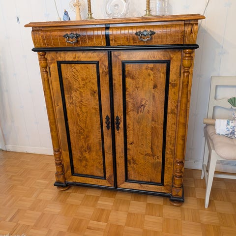 Stort äldre skåp i fint skick förutom skada vid ett av nyckelhålen ( se bild) . Bra till förvaring. Skåpet är mycket tungt. Säljes billigt mot bortforsling.