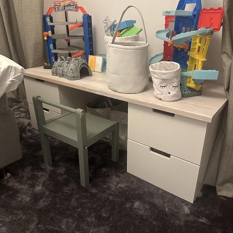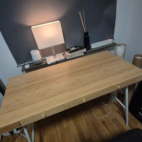 Skrivbordet är inköpt från Länna Möbler våren 2022 och passar in på de flesta ställen. Lite stött här och där men ett vackert bord som med lite kärlek kan bli som nytt eller för den som också har barn som behöver ett skrivbord som är okej att det är mindre skadad.