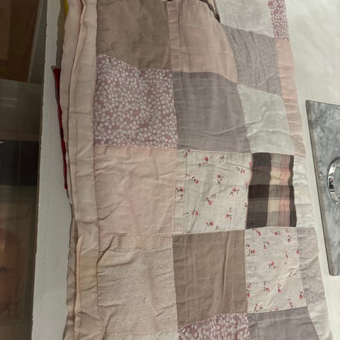 Säljer en virkad babyfilt i mysiga pastellfärger. Filten mäter ca 55 cm x 67 cm.