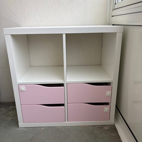 Vit IKEA-Kallax förvaringsmöbel med motiv av Musse Pigg. Möbeln består av flera fack och lådor för organiserad förvaring