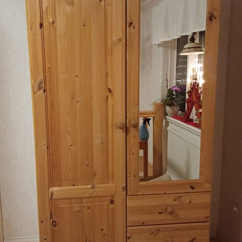 Vit garderob med tre dörrar, varav en med spegel. Inredningen består av hyllor och en stång för hängare