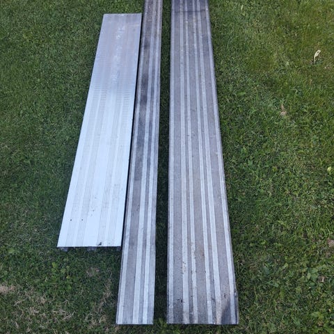 En stadig ramp i galvad durkplåt (snö och regn rinner alltså igenom) som vi använt till gödselkärran. Den har utan problem klarat 1m höjd. Den är nu delad 3+3m för transport, men höll bra hopsvetsad. Då vi nu förbereder gödsel platta behövs den inte längre. Tung, men ligger nära vägen.