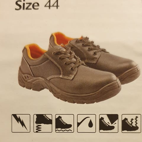 Svart skyddssko med orange detaljer och snören. Skorna har en robust sula och är designade för att ge skydd och komfort under arbetsdagen.