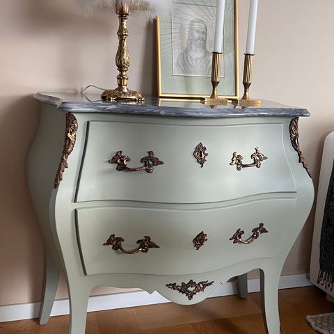 Svartmålad byrå i rokoko-stil med mässingsbeslag och överdel av grå sten.