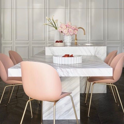 Custom made bord med 6 stolar. Bordsben är gjorda av vit metal och bordsskiva är sten silestone.