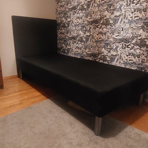 IKEA säng med madrass och sänggavel i grått tyg. Sängen har en enkel design med ben i trä och en hög sänggavel. Passar för en person och är lämplig för sovrum med begränsat utrymme.