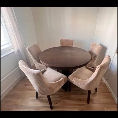 Matgrupp från Mio. Ingår ett bord samt fyra stolar. Bordets mått är 160x100 cm. Finns att hämta i Luthagen Uppsala. Betalning sker via Swish.