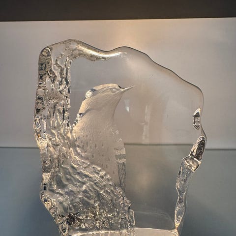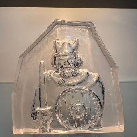 Glasfigur med gravyr av ett skepp/vikingskepp/fartyg/segel och är tillverkad i klart glas med texturerade ytor.