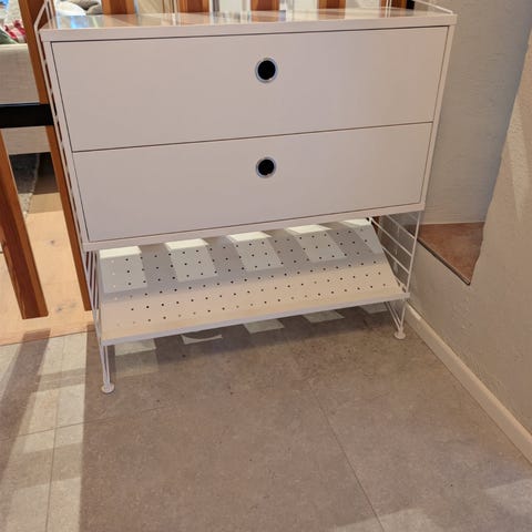 Jag säljer en kombinerad hatt- och skohylla, motsvarande Hall L Vit/Vit (https://www.stringfurniture.com/sv-se/series/system/combinations/hallway/bundle_h_l_12_12) men utan översta hyllplanet. Följande delar ingår: