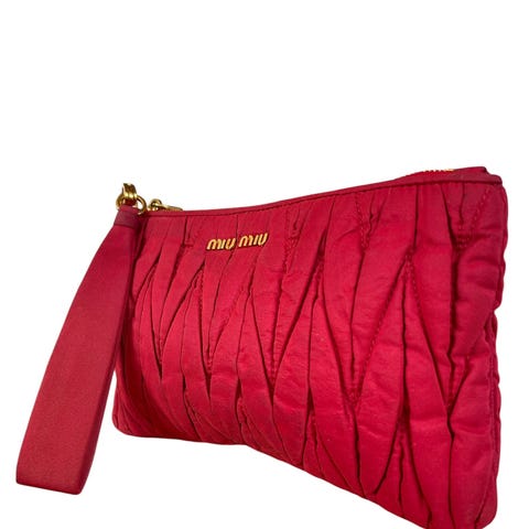 Miu Miu läderväska designad för kvinna. Väskan har en avlång form och en grå färg med veckad textur. Den är utrustad med ett handtag för bärbarhet och en dragkedja för stängning.