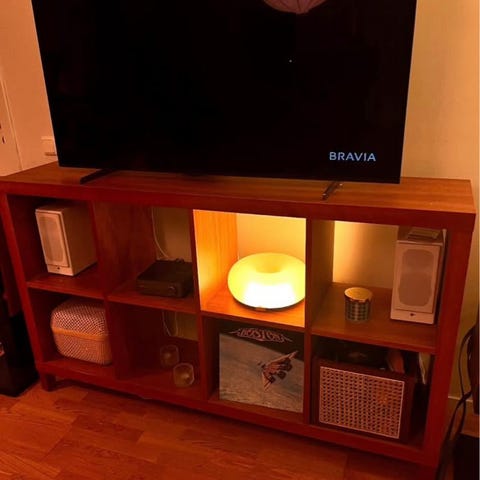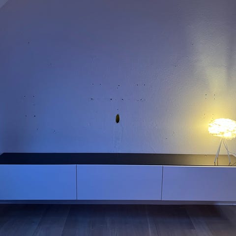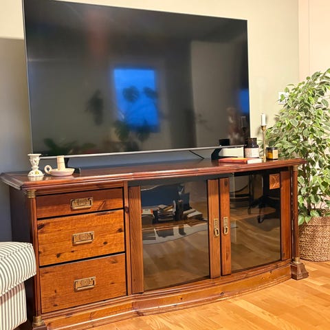 Har använts liggande som tv-bänk och tycker det blev så snyggt. Jag har använt två hyllplan som ”dörrar”.