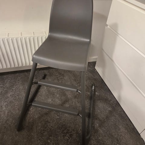 IKEA barnstol i vit färg. Tillverkad i plast och metall, avsedd för barn.