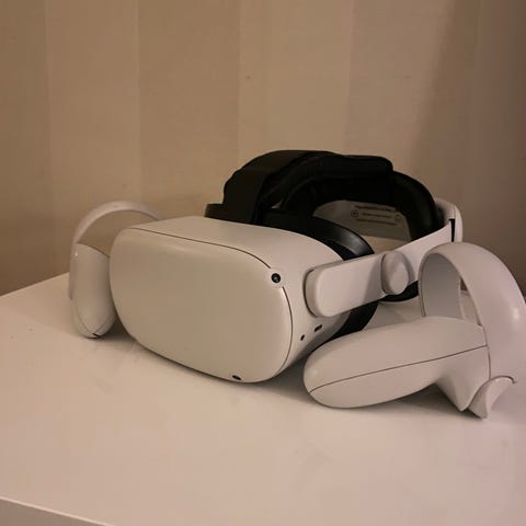 Oculus Quest 2 VR-headset med 64 GB lagringsutrymme i vit färg. Produkten inkluderar headset och två handkontroller. Användarvänligt stand-alone VR som ger mycket för pengarna. Vissa märken från användning finns, men inget som påverkar funktionaliteten.