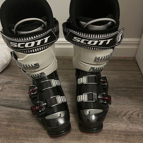Pjäxorna har fyra spännen använda 4 skiddagar 2025. 295mm