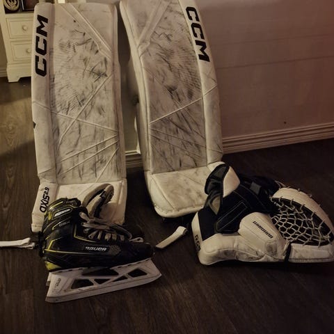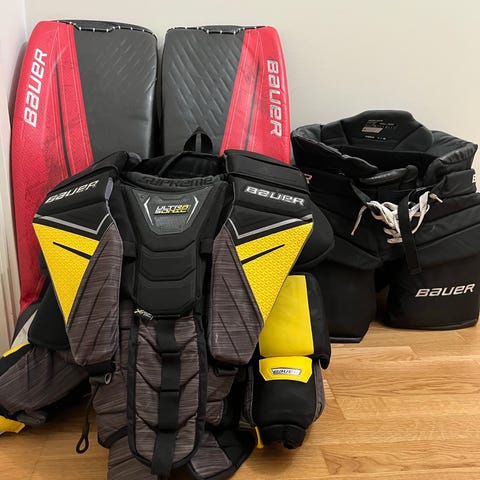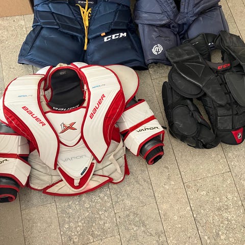 Tecno Pro 1000 målvaktsutrustning bestående av benskydd och handskar. Utrustningen är svart, vit och grå i färgen och är avsedd för användning inom ishockey eller liknande sporter där målvaktsskydd krävs.