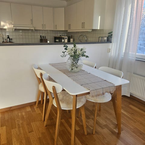 Stolar: IKEA Bernhard (utgått) närmst i sortiment idag är Lillånäs (nypris 1495kr/stol vilket är samma pris vi köpte våra stolar för)