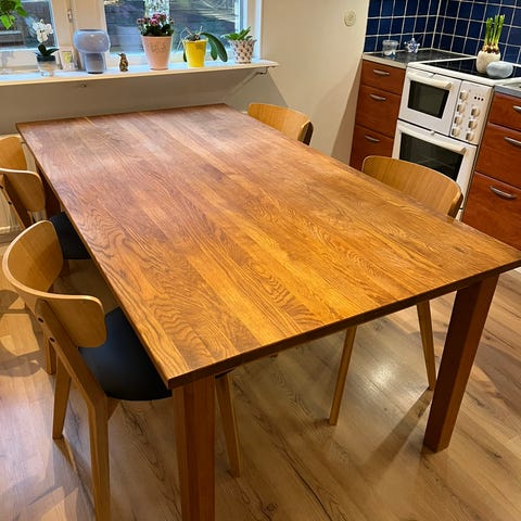 Ett solitt ekbord som är väl omhändertaget söker nu ett nytt hem då jag ska flytta till en större lgh. Bordet är 75*75 cm men har en klaff så att det kan bli 115 cm långt. Perfekt för en studentbostad till exempel!