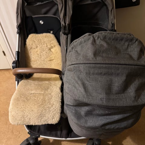 Duovagnen är en tvåsitsig barnvagn i grå färg. Vagnen är utformad för att rymma två barn samtidigt med separata sittplatser. Den har justerbara ryggstöd och säkerhetsbälten för varje sittplats. Handtag och skyddsbågar är klädda i brunt material. Vagnen har sex hjul (2 par framme och 2 bak)och ramarna med svart finish.