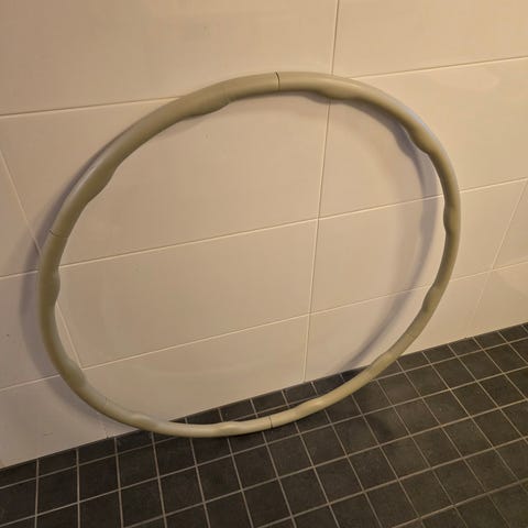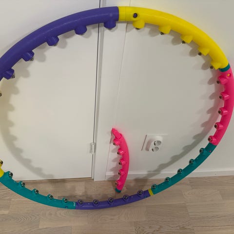 Hopfällbar träningshula hoop med en diameter på cirka 70 cm. Färgerna är svart och röd. Tillverkad av plastmaterial med vadderade sektioner för komfort vid användning. Passar för träning och motion.
