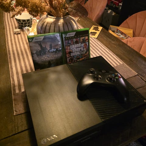 Xbox Series S med handkontroll och två spel
