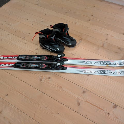 Skidor för de minsta. Vallningsfria. Stavar medföljer på köpet om köparen vill ha dem. De fungerar fint för ändamålet men har skador, se bild 4.