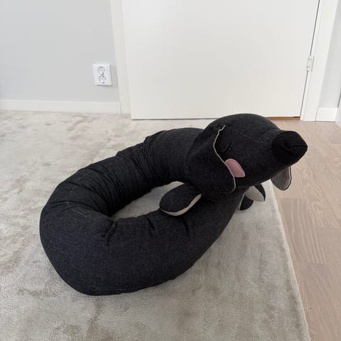 Söt handdocka i form av svart fladdermus med rosa öron, grå mage, svarta vingar och små fötter.