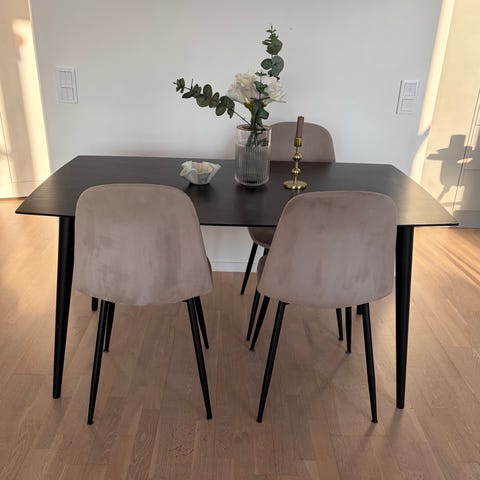 Säljer ett stilrent matbord och köksstolar i färgen valnöt mörkbrunt beige grå med assymetrisk bordsskiva i MDF som ser ut som sten. Ett skandinaviskt matbord som passar perfekt både till vardag och middagar med gäster. Sitsen är beigegrå.