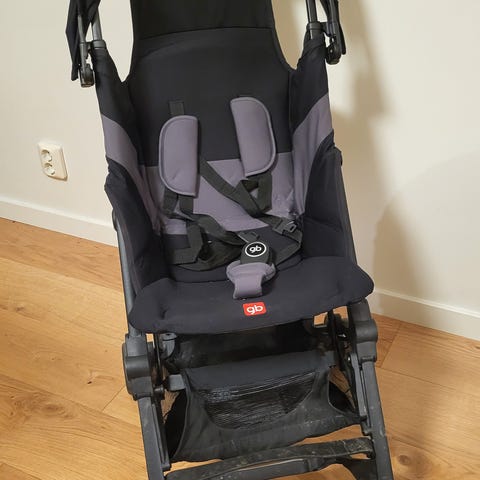Hopfällbar barnvagn i svart färg. Barnvagnen är utrustad med säkerhetssele och har en hopfällbar design för enkel förvaring och transport. Får plats under flygstolar och kan bäras som handbagage på ett flygplan.