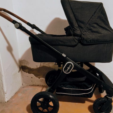 Den är komplett, med regnskydd för liggdelen. Tyget är lite slitet och ett av däcken lite skadat, men vagnen är fullt fungerande.