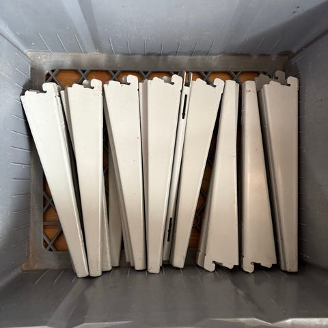 Metallhyllplan och hyllprofiler för lagerhyllor. Hyllplanen är i metall och staplade på högkant på bilderna, tillsammans med tillhörande profiler/skenor. Lämpliga för exempelvis förråd, verkstad eller lagerinredning där man behöver stabila och tåliga hyllsektioner. Exakta mått och antal kan anges av säljaren vid behov.