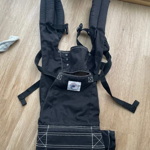Ergobaby bärsele i färgerna grå och svart. Bärselen har justerbara remmar och en bred midjeband för stöd. Materialet är mjukt och anpassat för att bära barn bekvämt och säkert.