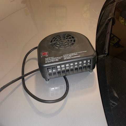 Calix Elektrisk kupévärmare med svart och orange hölje. Enheten är avsedd för att förvärma motorer och innehåller flera ventilationsgaller för värmeavledning. Utrustad med strömkabel och anslutningar för installation.