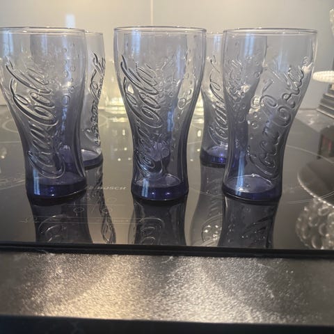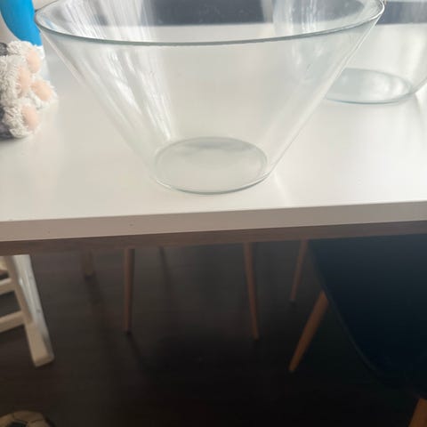 Åhléns Home glas med tillhörande träbricka. Glasen är genomskinliga och brickan är tillverkad av trä. Setet består av 6 glasskålar och 2 träbricka , en glasskål gick sönder där av priset
