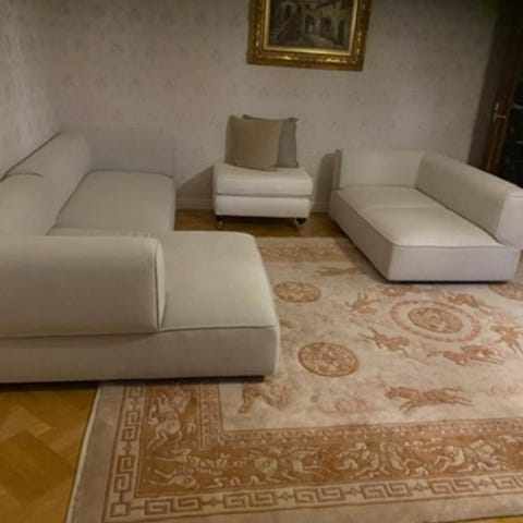 Säljer en underbar soffgrupp i ljus beige färg. Sofforna är väldigt bekväma, perfekta både för att sitta eller lägga sig och vila. De är höga och ger ett elegant och lyxigt intryck.