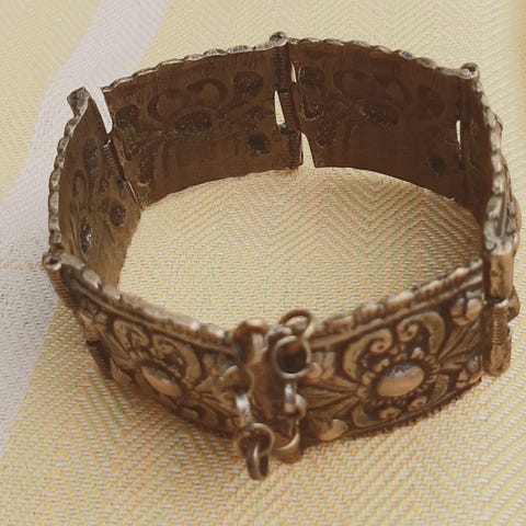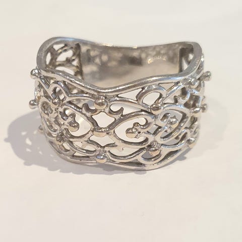 Silverarmband för kvinna med dekorativt mönster i metall. Armbandet är öppet och har en böjd form som passar runt handleden. Diameter 60mn, bredd 20mm, vikt 23 gram