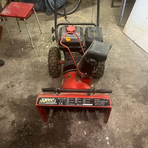 Röjbredd 35cm och har skovelhjul m kraftigt gummi.