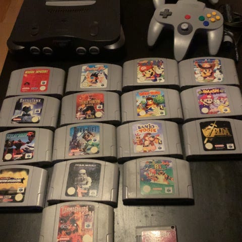 Nintendo 64 spelkonsol inklusive tre spelkassetter och två handkontroller. Spelen som medföljer är Donkey Kong 64, GoldenEye 007 och ett tredje spel. Konsolen och tillbehören är avsedda för Nintendo 64-systemet.