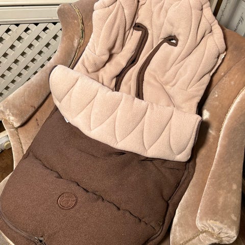 Najell åkpåse i offwhite färg med fleecefoder. Materialet är mjukt och isolerande för att hålla barnet varmt. Produkten är designad för användning i barnvagn eller vagn, lämpad för kallare väder.